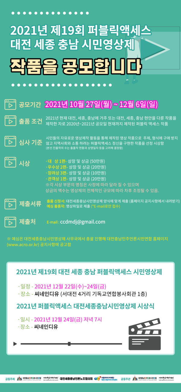 대전충남민주언론시민연합은 대전독립영화협회와 함께 주관 '제 19회 퍼블릭액세스 대전세종충남 시민영상제 작품 공모'를 12월 6일까지 진행한다.