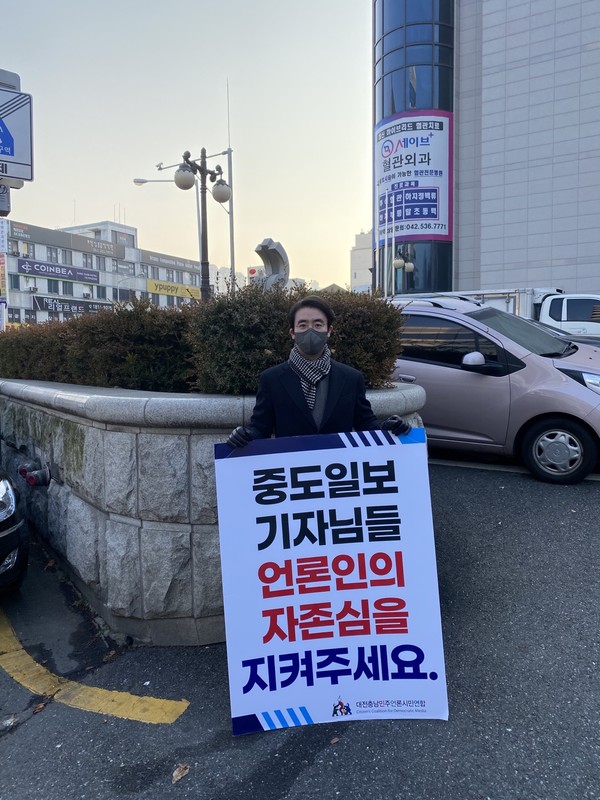 4. 한편 대전충남민주언론시민연합은 지난 11월 30일(화)부터 중도일보 사옥 앞에서 중도일보의 편집권 독립을 촉구하는 1인 시위를 진행 한 바 있다. 이날 1차 행동을 마무리하고 부원건설과 중도일보의 책임 있는 조치를 촉구했다. <끝>