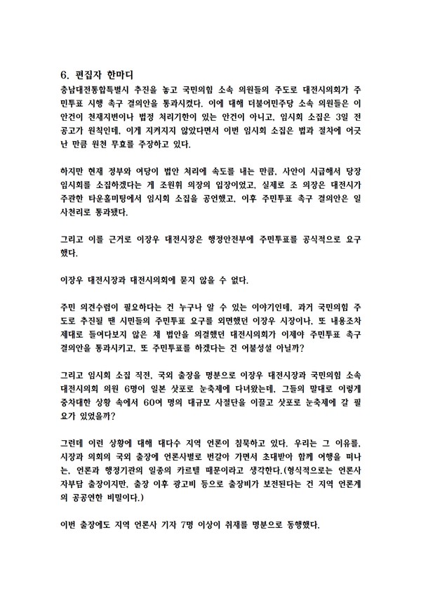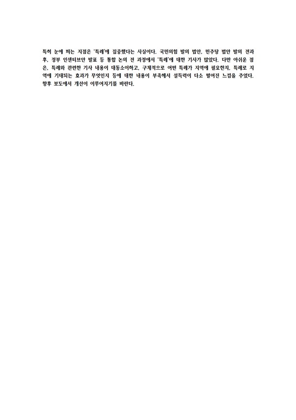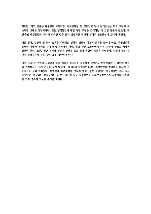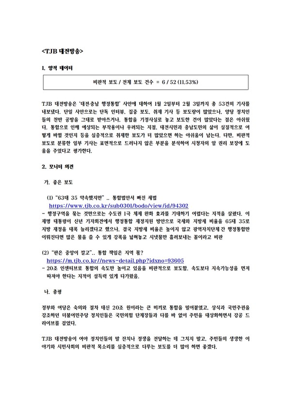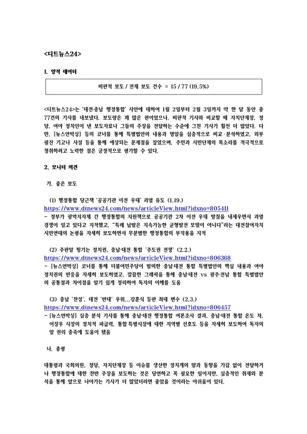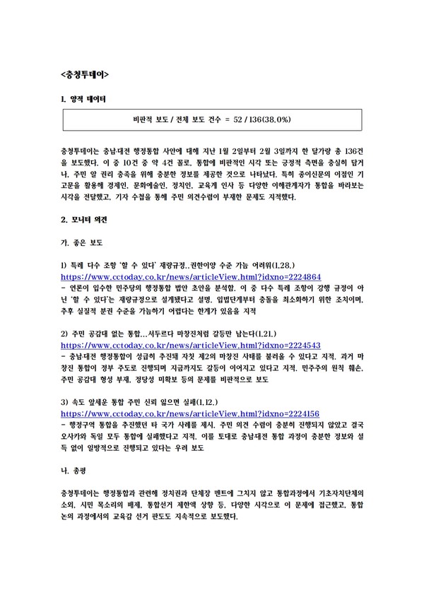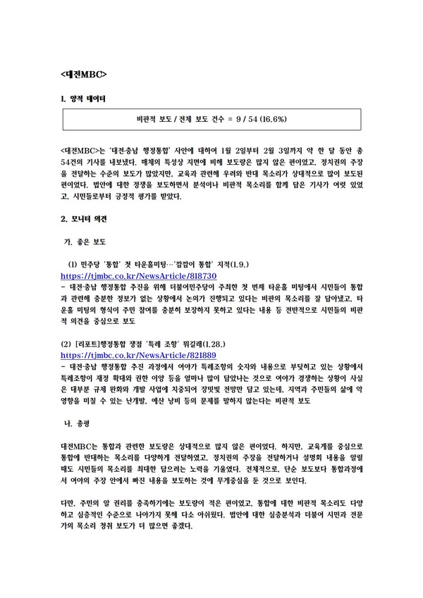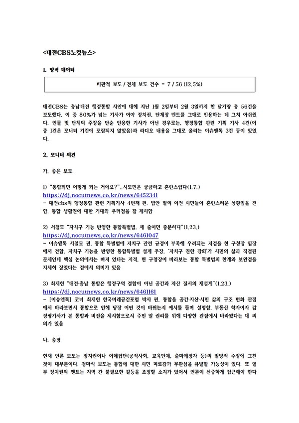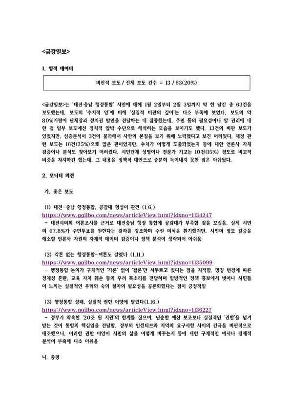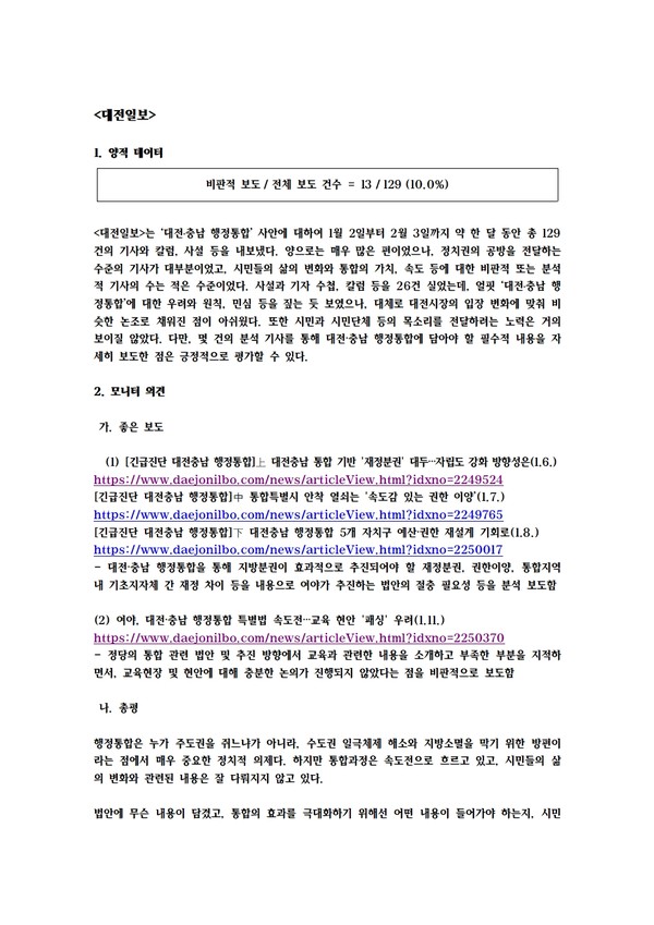 - 각 모니터 위원이 지역 언론사가 해당기간 ‘대전․충남 행정통합’ 이슈를 어떻게 보도했는지 분석하고 평가
