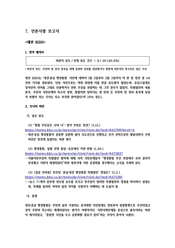- 전체 보도량 대비 ‘비판적 보도’가 차지한 비율, ‘좋은 보도’로 여겨지는 기사 링크와 선정 이유. 주민의 알 권리